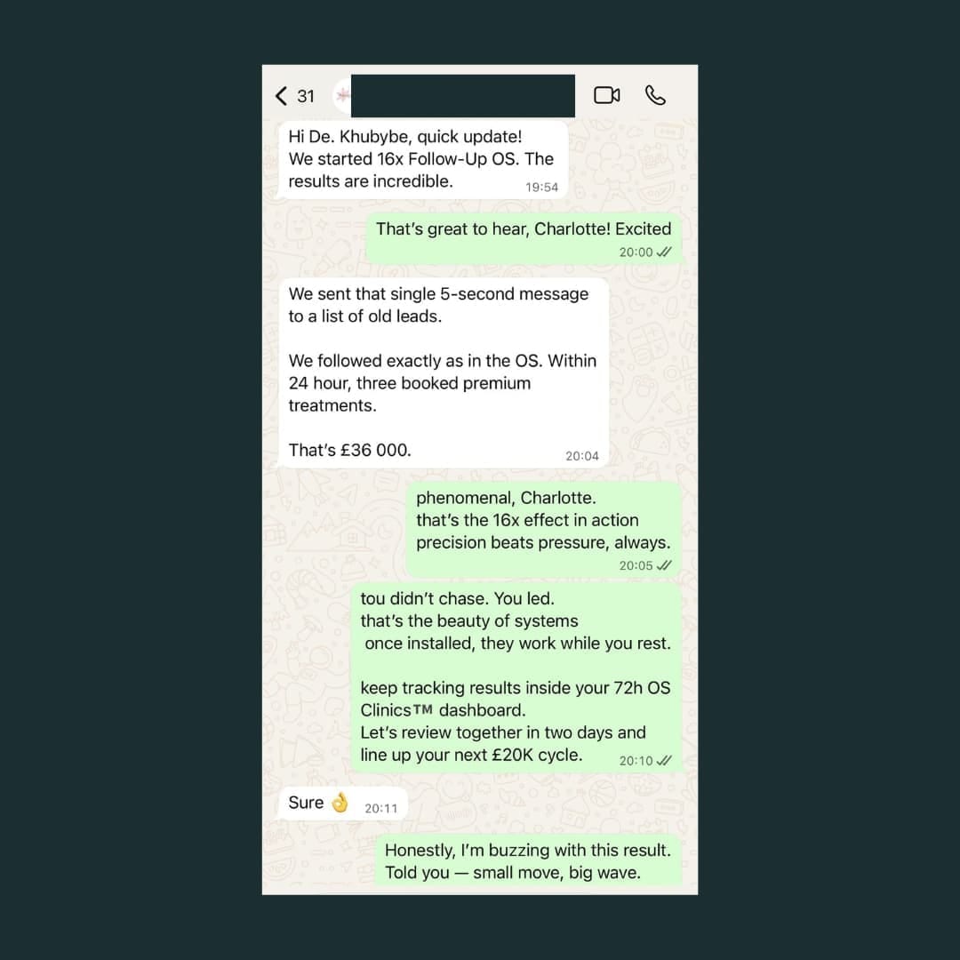 We tested 16x Follow-Up OS™ in a London clinic. One five-second message sent to inactive leads.